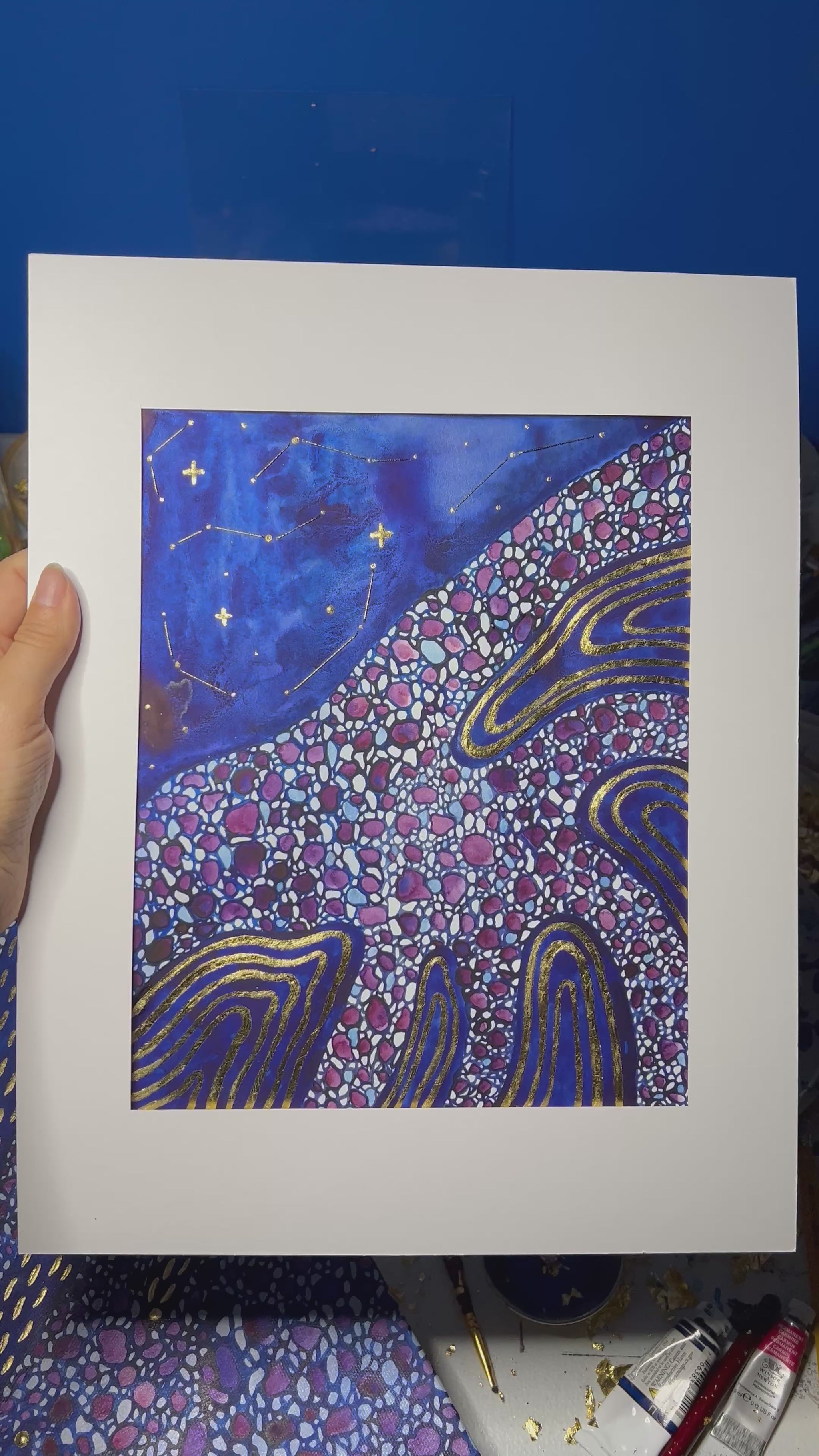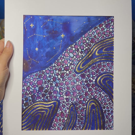 Original 8x10 painting, matted to 11x14 and ready to frame. Made with watercolors, gold leaf, and thread for the constellations.