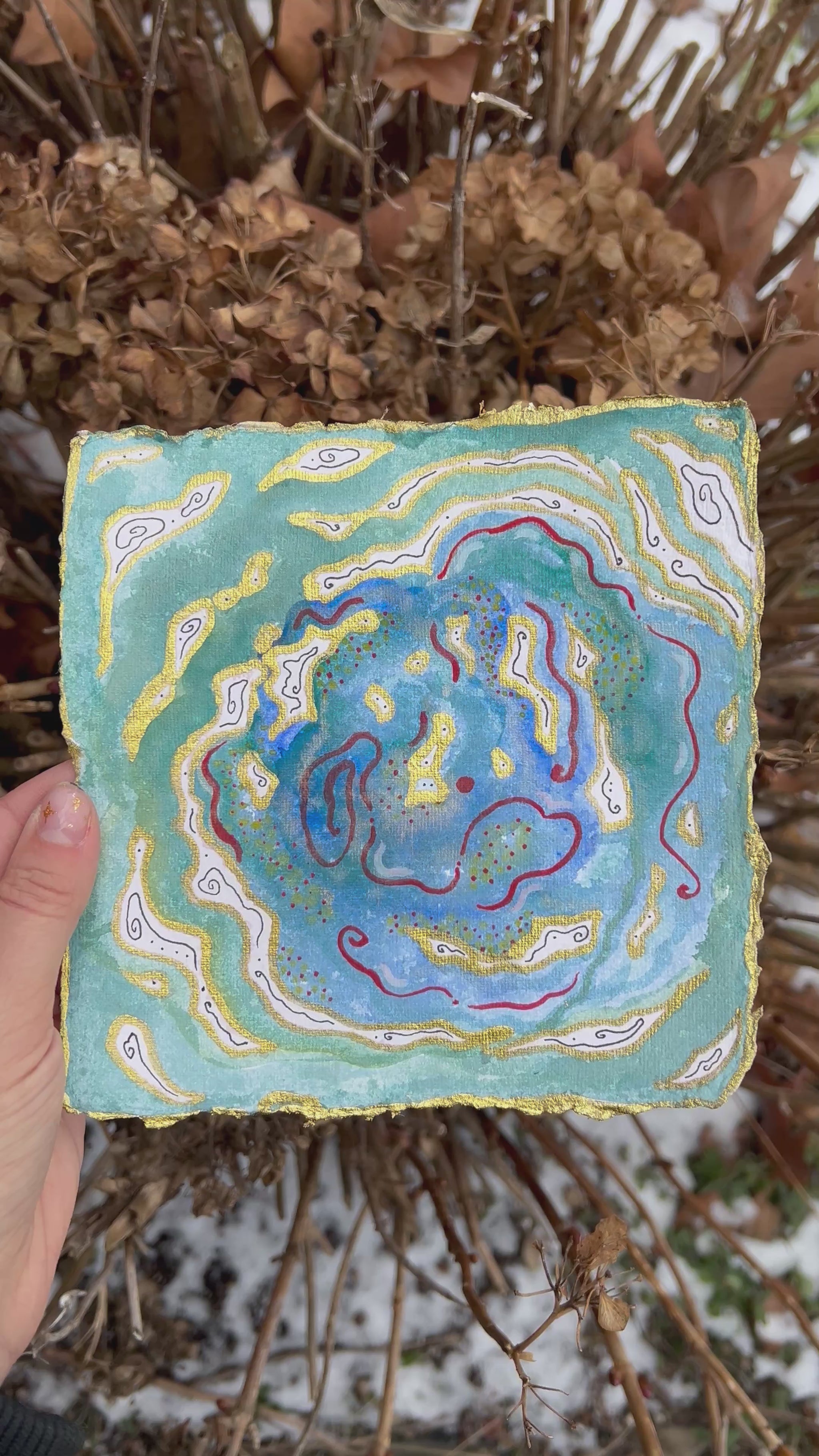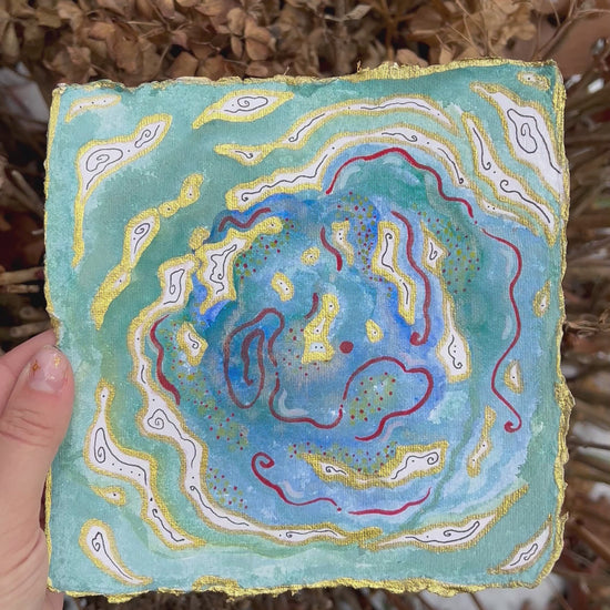 A small 6.5 x 6.5 painting on handmade paper, with watercolor and inks.