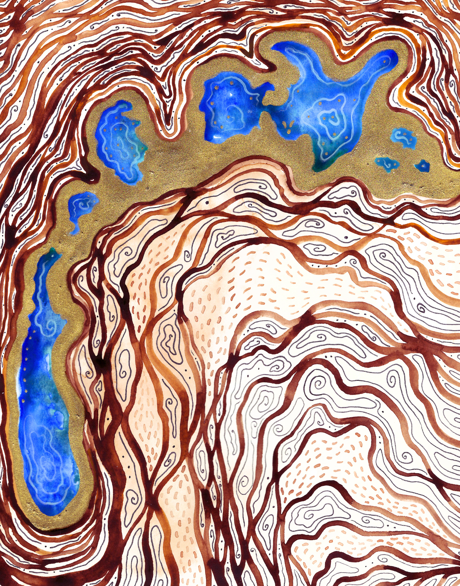 For this painting, I was inspired by a quote and proverb by the locals in the region. First, when this area started to collapse, the locals referred to the salt deposits left in the dusty seabed as "the dry tears of the Aral." Second, a local proverb showed how much they revered the water before it disappeared, saying that "In every drop of water there is a grain of gold." I wanted to incorporate both of these ideas into this painting, with droplets of gold in the sea that's left, and golden tears running throughout the exposed desert. Restoration efforts are being worked on. Since 2023, approximately 5 billion cubic meters of water have flowed into the basin, bringing the total reserve to 24.1 billion cubic meters. Local restoration projects hope to bring the fishing industries back to the area eventually.